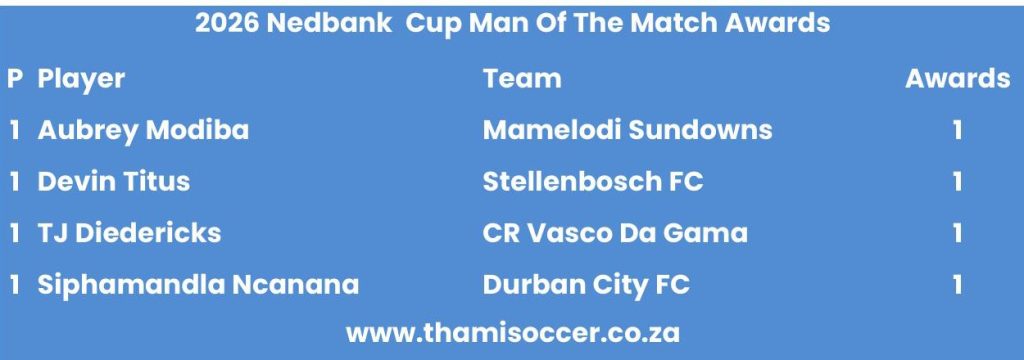 Nedbank Cup Man Of The Match Awards 6 February 2026 Posted on 2026-02-062026-02-07 By Thami Mshengu No Comments on Nedbank Cup Man Of The Match Awards 6 February 2026 (Visited 13 times, 1 visits today)Share this:TwitterWhatsAppPrintTumblrLinkedInFacebookTelegramRedditPocket Related Nedbank Cup Tags:Aubrey Modiba, Devin Titus, Siphamandla Ncanana, TJ Diedericks