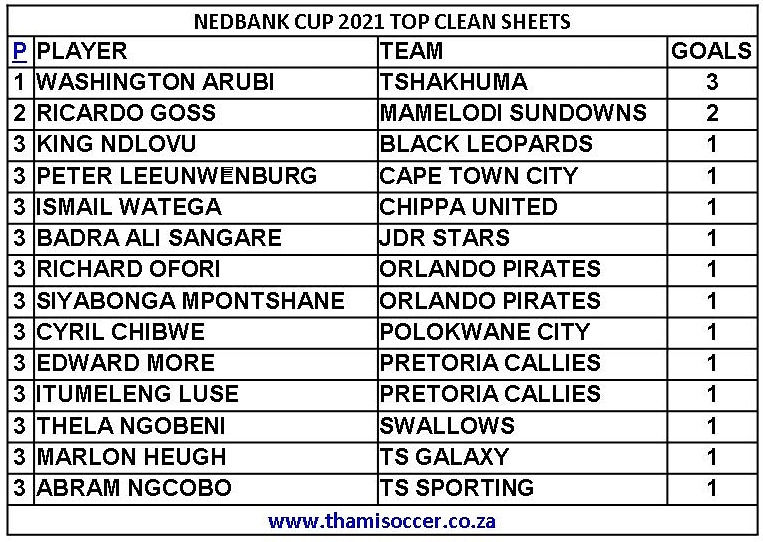 Nedbank Cup Top Clean Sheets 18 April 2021 Posted on 2021-04-192021-04-19 By Thami Mshengu No Comments on Nedbank Cup Top Clean Sheets 18 April 2021 (Visited 20 times, 1 visits today)Share this:TwitterWhatsAppPrintTumblrLinkedInFacebookTelegramRedditPocket Related Nedbank Cup Tags:Washington Arubi