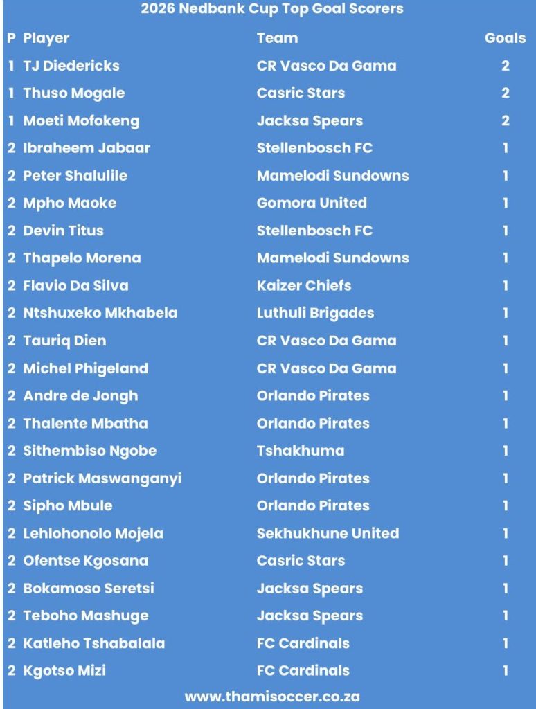 Nedbank Cup Top Goal Scorers 7 February 2026 Posted on 2026-02-072026-02-11 By Thami Mshengu 1 Comment on Nedbank Cup Top Goal Scorers 7 February 2026 (Visited 8 times, 1 visits today)Share this:TwitterWhatsAppPrintTumblrLinkedInFacebookTelegramRedditPocket Related Nedbank Cup Tags:Moeti Mofokeng, Thuso Mogale, TJ Diedericks