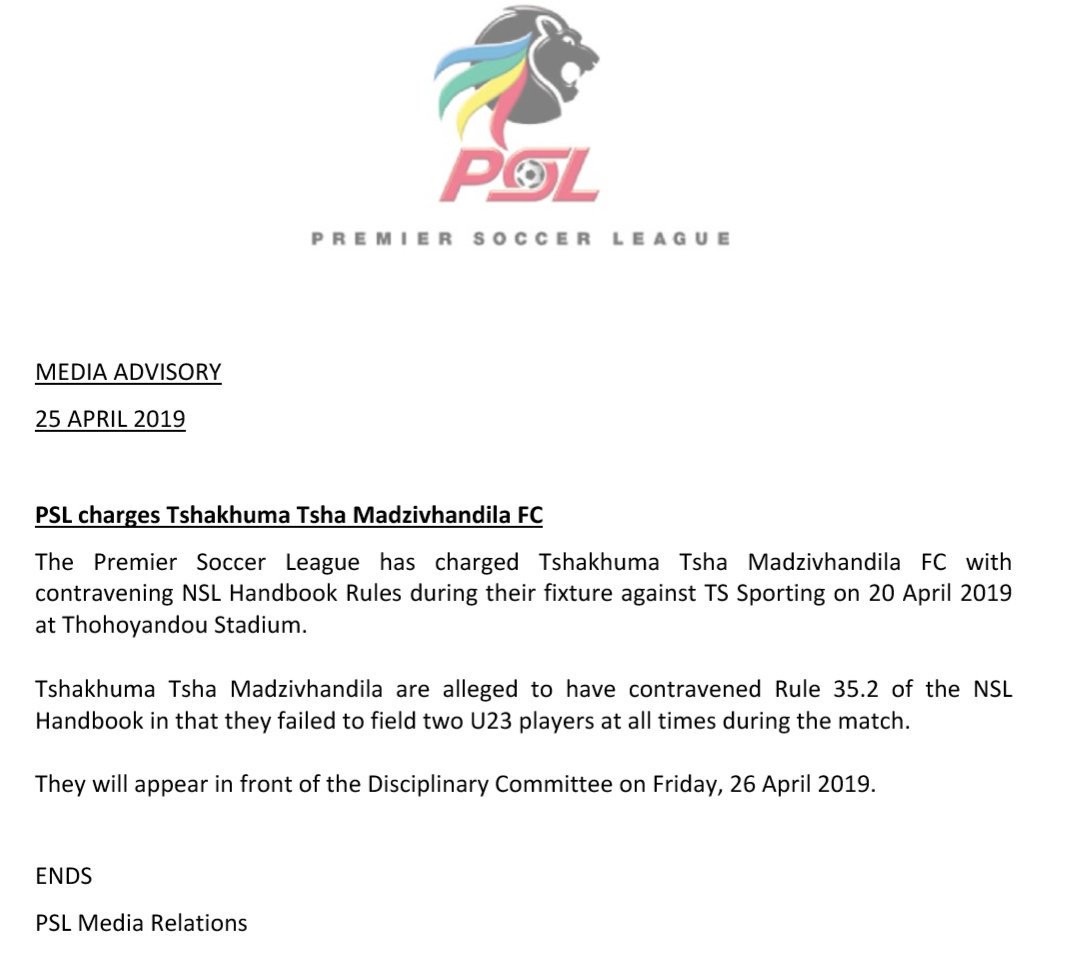 Official PSL charges Tshakhuma Tsha Madzivhandila Posted on 2019-04-25 By Thami Mshengu No Comments on Official PSL charges Tshakhuma Tsha Madzivhandila (Visited 25 times, 1 visits today)Share this:TwitterWhatsAppPrintTumblrLinkedInFacebookTelegramRedditPocket Related Motsepe Foundation Championship