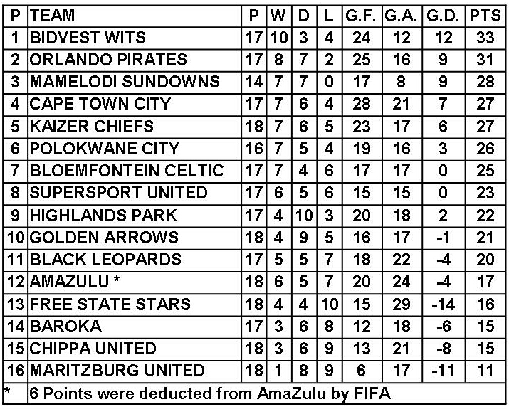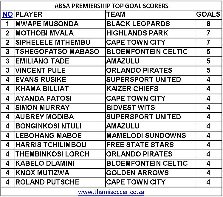 Mwape Musonda of Black Leopards is the ABSA Premiership Top Goal Scorer with 8 goals Saturday, 19 January 2019 Chippa United 2-0 Maritzburg United, Nelson Mandela Bay Stadium Tebogo Tlolane and Andile Mbenyane netted for Chilli Boys and Clinton Larsen recorded his first victory as the head coach of Eastern Cape side. Black Leopards 1-1…