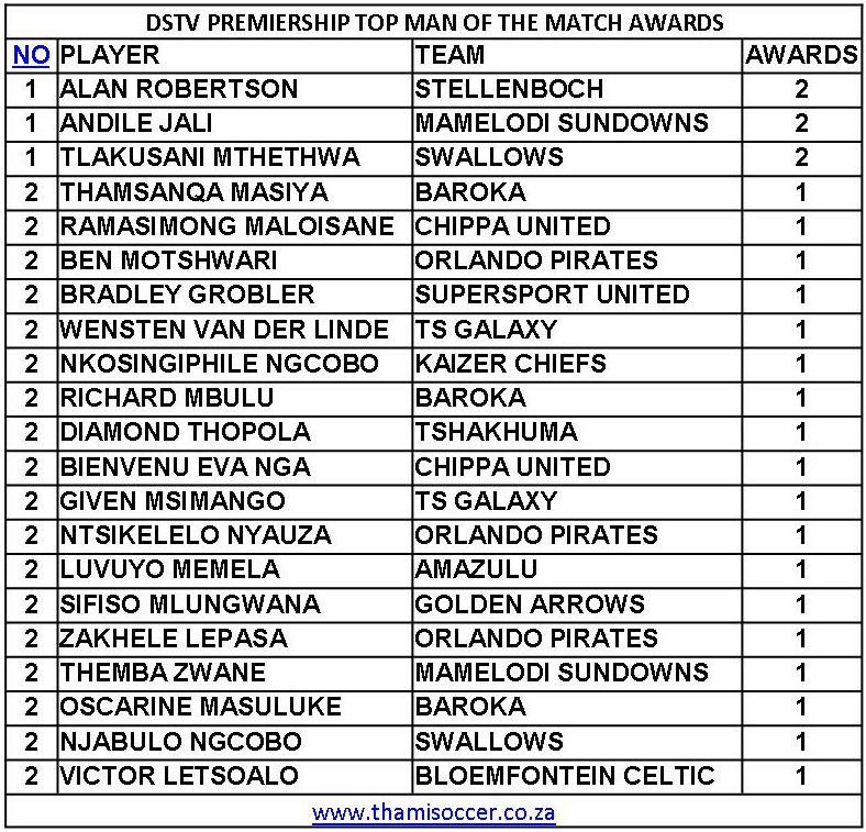 Three players suspended for 6 March 2021 DStv Premiership matches. Alan Robertson of StellenboschHe picked up his fourth yellow card on 21 February 2021. Ndumiso Mabena of Bloemfontein CelticHe was sent off on 2 March 2021. Nazeer Allie of Maritzburg UnitedHe picked up his fourth yellow card on 2 March 2021.