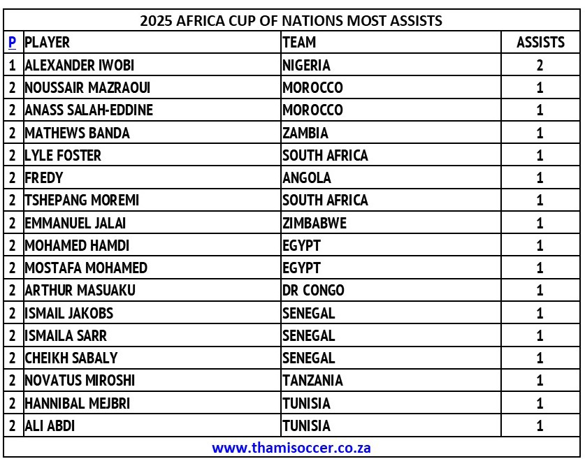 Africa Cup Of Nations Most Assists 31 December 2025 Posted on 2025-12-312026-01-02 By Thami Mshengu No Comments on Africa Cup Of Nations Most Assists 31 December 2025 Africa Cup of Nations