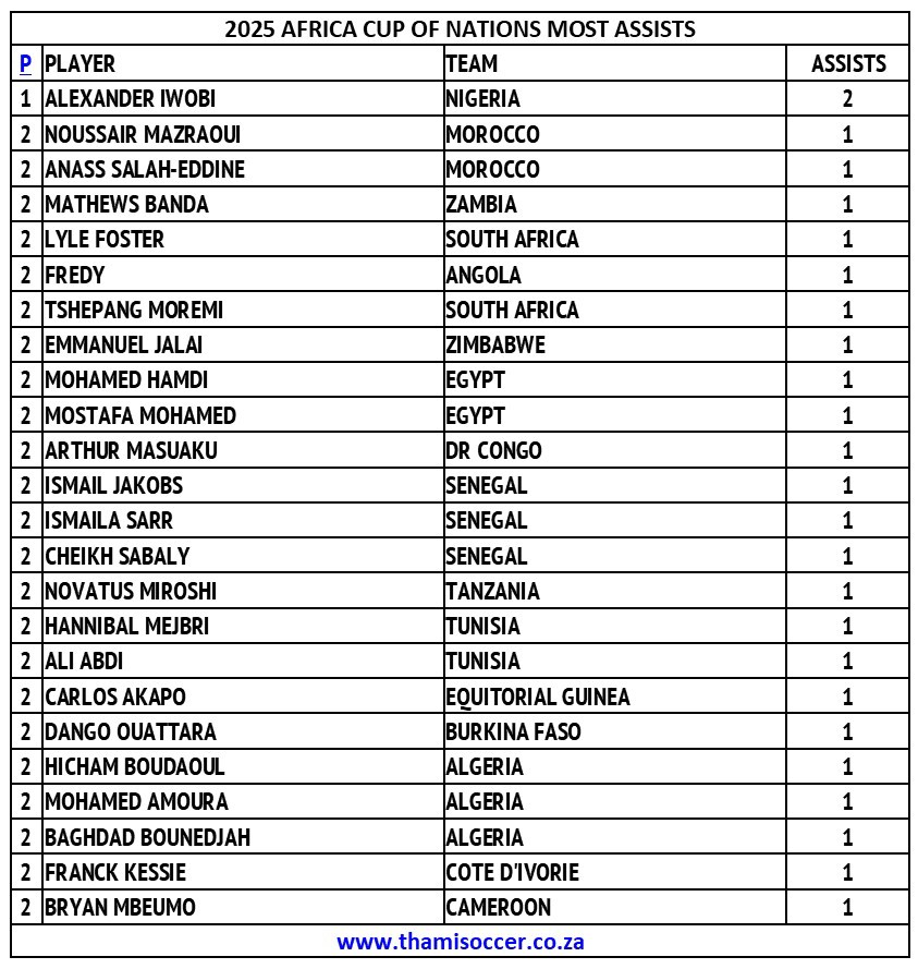 Africa Cup Of Nations Most Assists 29 December 2025 Posted on 2025-12-292025-12-31 By Thami Mshengu No Comments on Africa Cup Of Nations Most Assists 29 December 2025 Africa Cup of Nations
