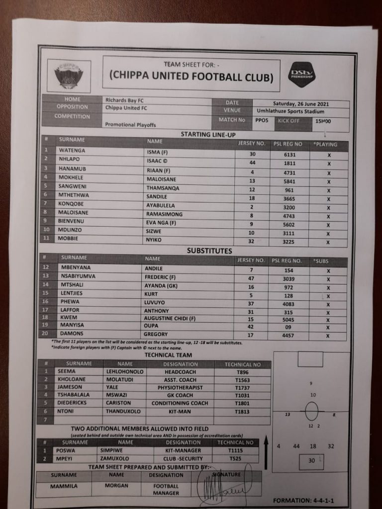 Chippa United Team Sheet 26 June 2021 Posted on 2021-06-262021-06-26 By Thami Mshengu No Comments on Chippa United Team Sheet 26 June 2021 Premier Soccer League Play-Off