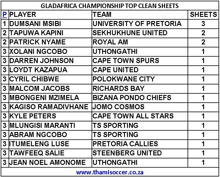 GladAfrica Championship Top Clean Sheets 23 December 2020 Posted on 2020-12-232021-02-12 By Thami Mshengu No Comments on GladAfrica Championship Top Clean Sheets 23 December 2020 Motsepe Foundation Championship