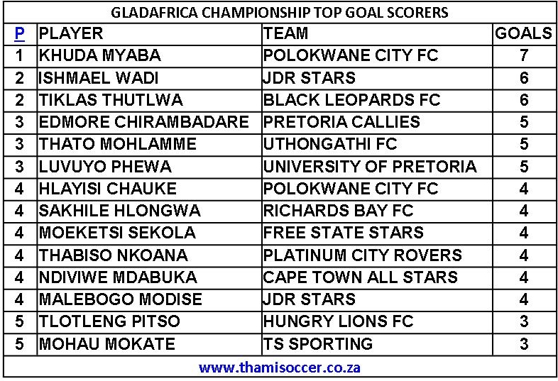 GladAfrica Championship Top Goal Scorers 17 October 2021 Posted on 2021-10-182021-10-25 By Thami Mshengu No Comments on GladAfrica Championship Top Goal Scorers 17 October 2021 Motsepe Foundation Championship