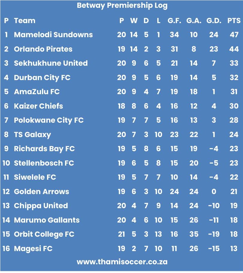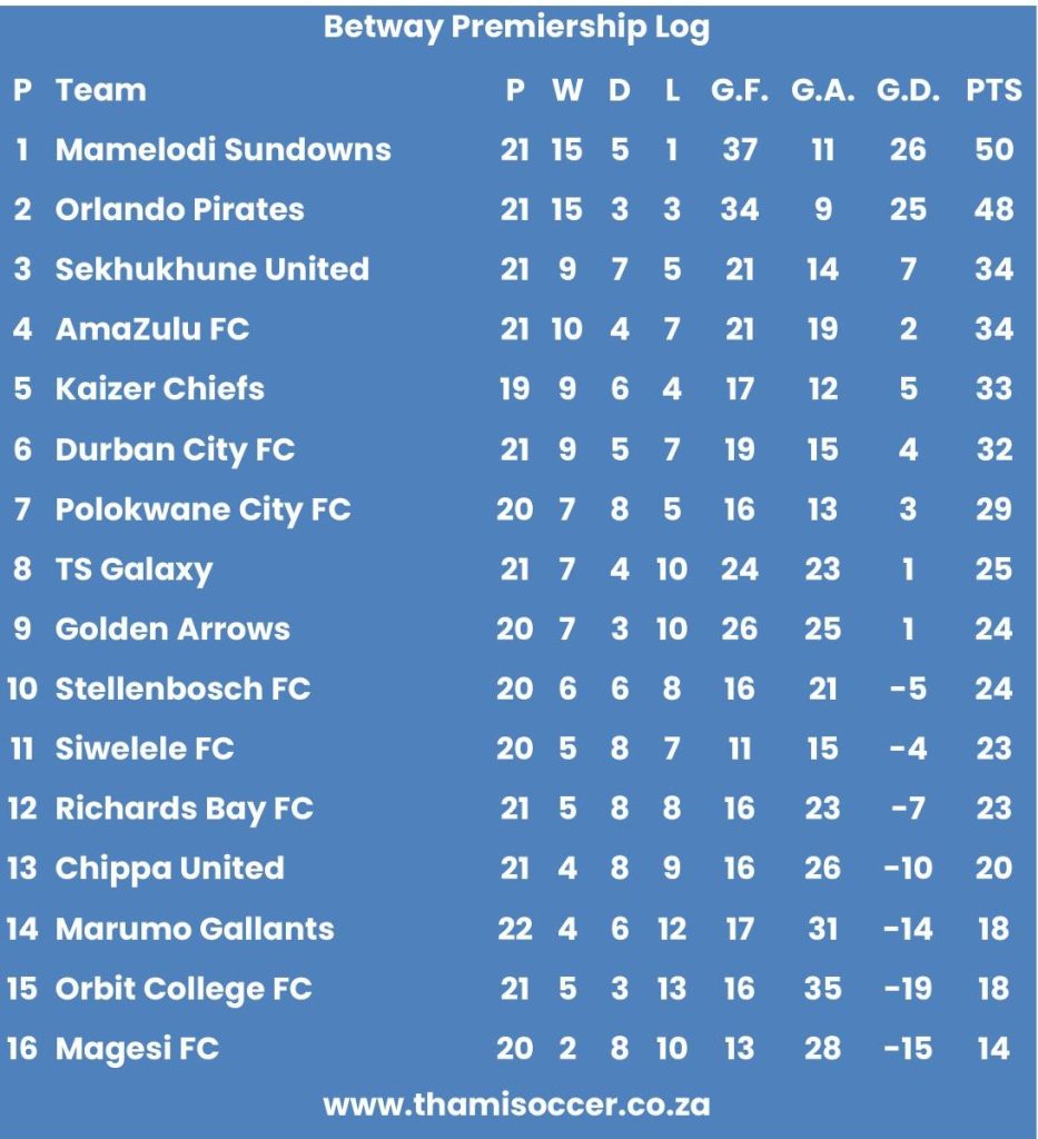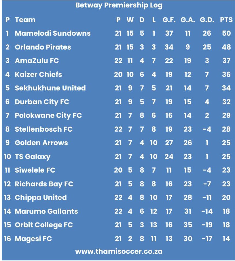 Betway Premiership Log 21 March 2026