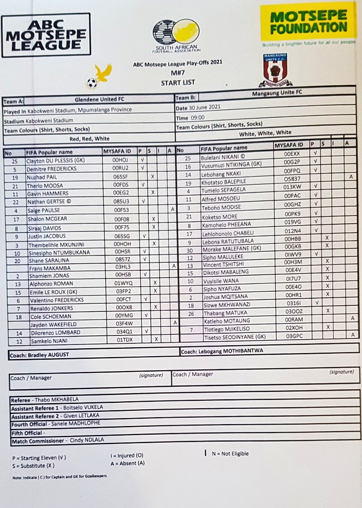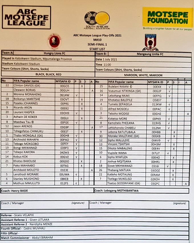 Hungry Lions FC vs Mangaung Unite Team Sheets 1 July 2021