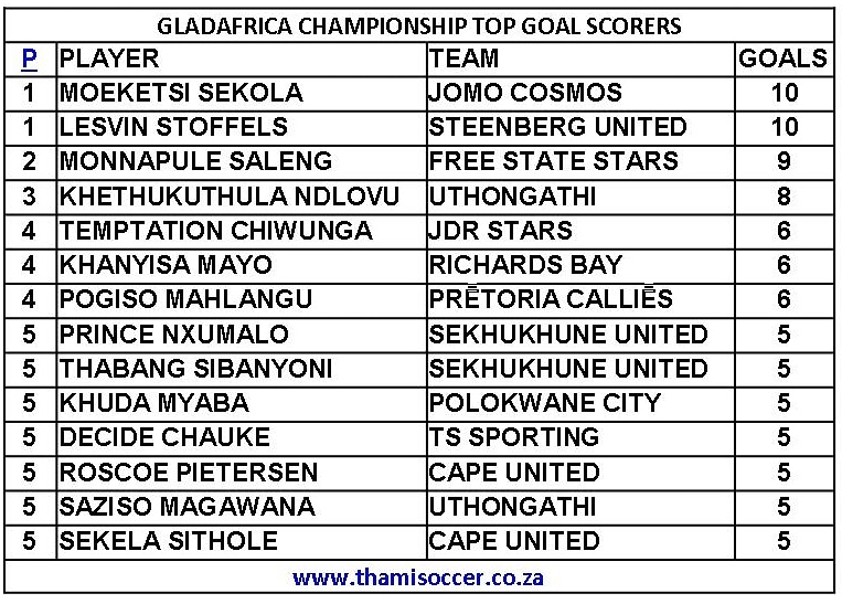 GladAfrica Championship Top Goal Scorers 3 April 2021 Posted on 2021-04-042021-04-04 By Thami Mshengu No Comments on GladAfrica Championship Top Goal Scorers 3 April 2021 Motsepe Foundation Championship