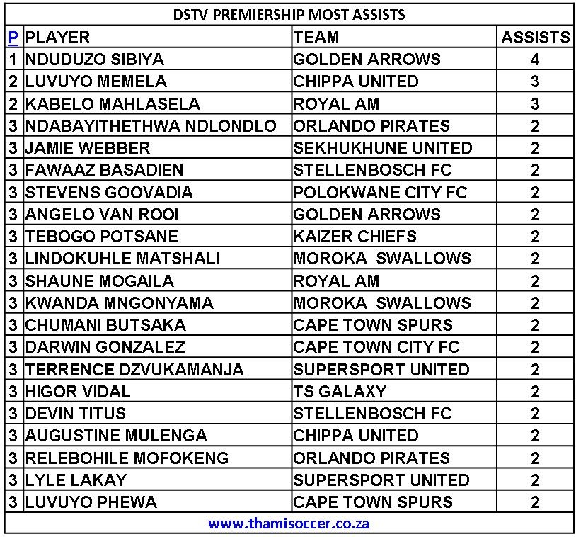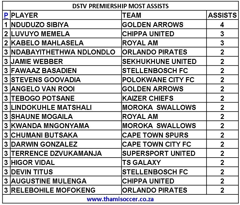 DStv Premiership Most Assists 25 November 2023 Posted on 2023-11-252023-11-26 By Thami Mshengu No Comments on DStv Premiership Most Assists 25 November 2023 Betway Premiership