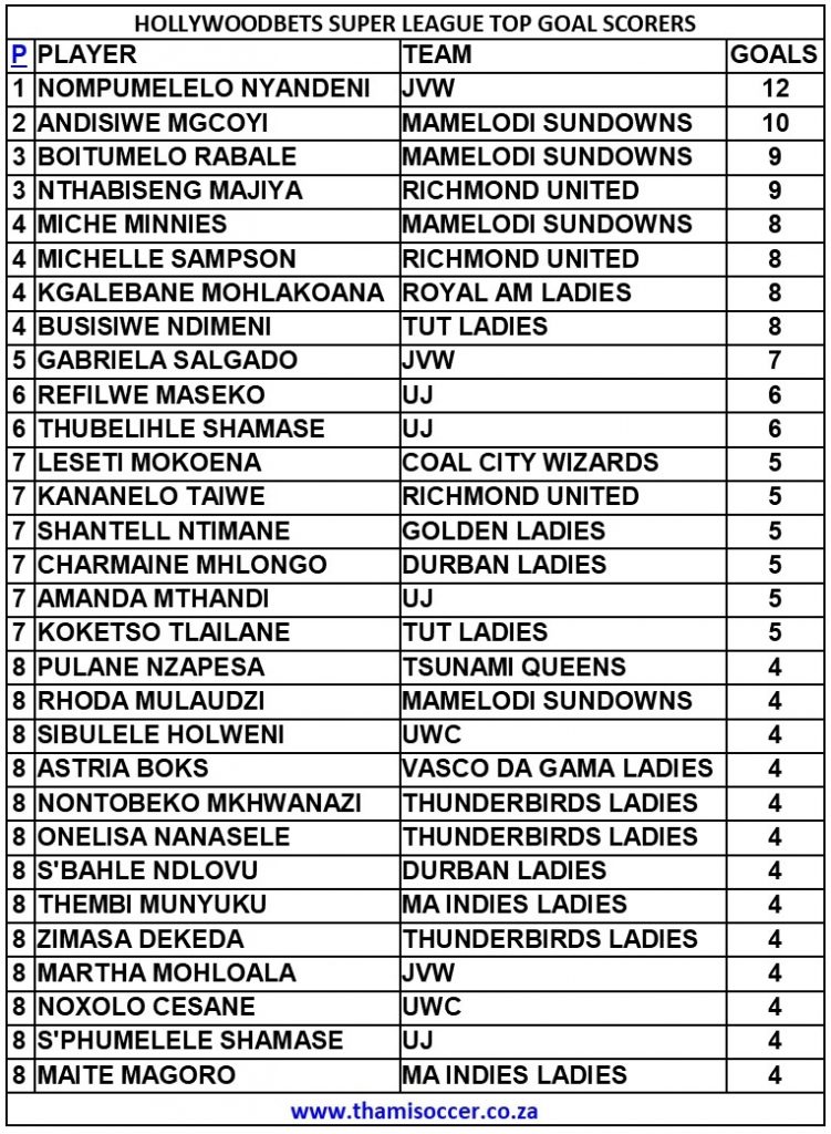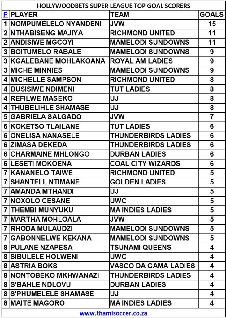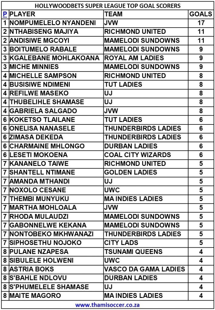 Nompumelelo Nyandeni netted a brace for JVW against Ma Indies Ladies at Wits Football Stadium. Wednesday, 17 August 2022Durban Ladies 1-2 Thunderbirds Ladies, Sugar Ray Xulu StadiumZoleka Shezi opened the scoring for the visitors. Zimasa Dekeda doubled the lead for the Eastern Cape side. The away side went into the halftime break leading by 2-0….