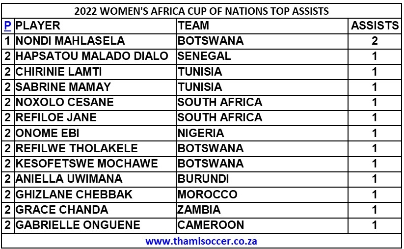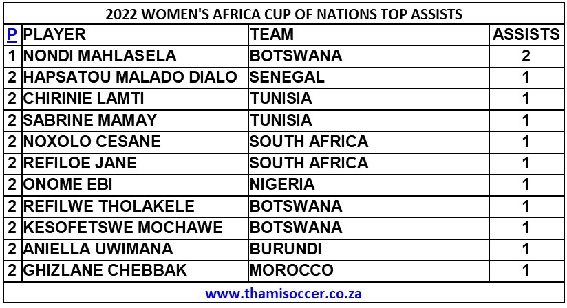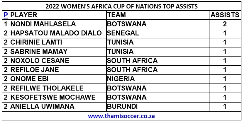 Women’s Africa Cup of Nations Top Assists 5 July 2022 Posted on 2022-07-062022-07-06 By Thami Mshengu No Comments on Women’s Africa Cup of Nations Top Assists 5 July 2022 Women’s Africa Cup of Nations
