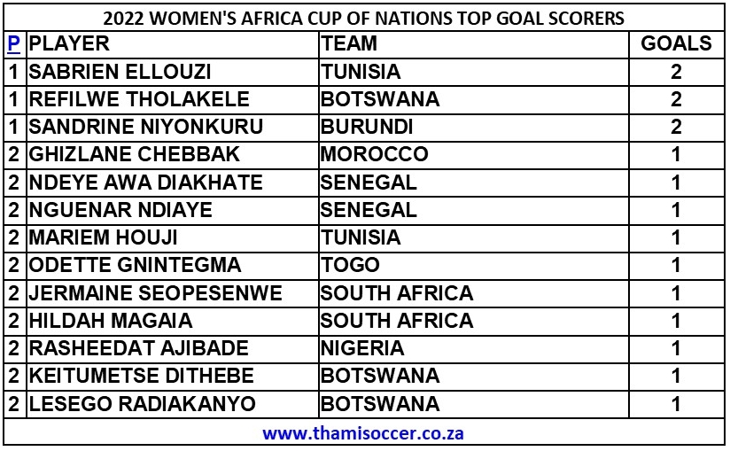 Women’s Africa Cup of Nations Top Goal Scorers 5 July 2022 Posted on 2022-07-062022-07-06 By Thami Mshengu No Comments on Women’s Africa Cup of Nations Top Goal Scorers 5 July 2022 Women’s Africa Cup of Nations