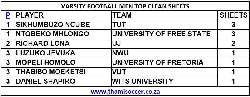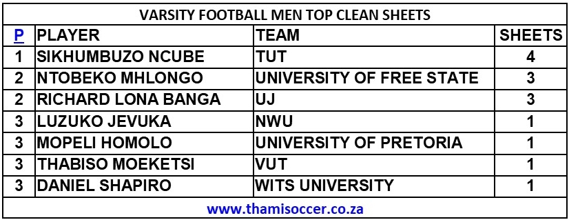 Varsity Football Men Top Clean Sheets 18 August 2022 Posted on 2022-08-192022-08-19 By Thami Mshengu No Comments on Varsity Football Men Top Clean Sheets 18 August 2022 Varsity Football