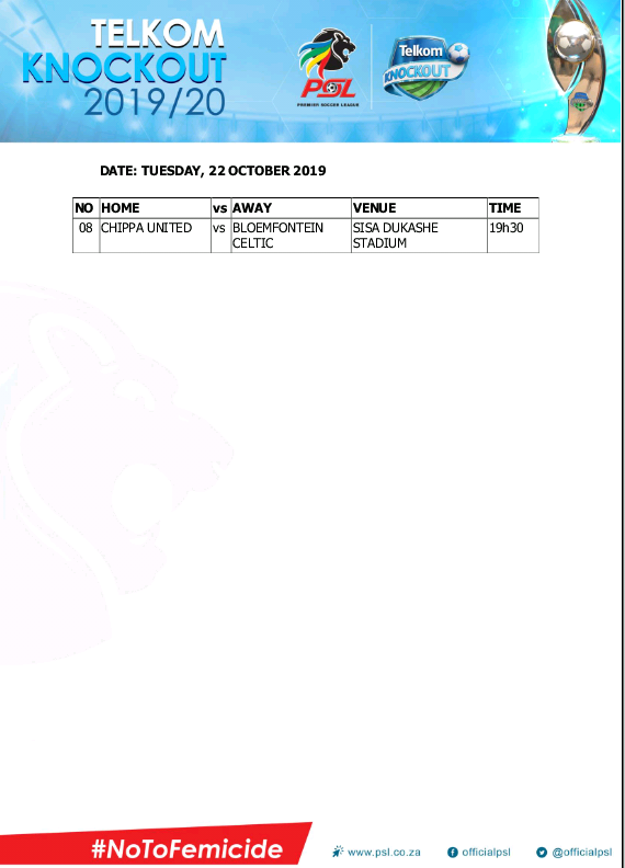 Telkom Knockout dates, venues and kick-off times Part 2 Posted on 2019-10-10 By Thami Mshengu No Comments on Telkom Knockout dates, venues and kick-off times Part 2 (Visited 51 times, 1 visits today)Share this:TwitterWhatsAppPrintTumblrLinkedInFacebookTelegramRedditPocket Related Carling Knockout