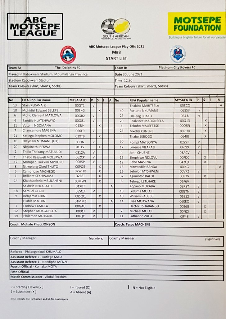 The Dolphins FC vs Platinum City Rovers Team Sheets 30 June 2021 Posted on 2021-07-012021-07-01 By Thami Mshengu No Comments on The Dolphins FC vs Platinum City Rovers Team Sheets 30 June 2021 (Visited 285 times, 1 visits today)Share this:TwitterWhatsAppPrintTumblrLinkedInFacebookTelegramRedditPocket Related ABC Motsepe League Tags:Platinum City Rovers, The Dolphins FC